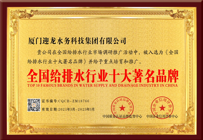 厦门迎龙水务科技集团有限公司是上海迎隆水务工程设备(集团)有限公司全资子公司,注册资金8666万元,是集研发、生产、销售、安装钢塑复合水箱、不锈钢水箱、箱泵一体化、BDF地埋式水箱、变频恒压给水设备于一体的综合性供水公司。公司通过ISO9001:2015标准认证,同时获得福建省卫生厅颁发“卫生许可批件”“福建省疾病预防控中心的检测报告”以及荣获“中国驰名品牌”“中国百强优秀企业”“中国高新技术企业”“全国给排水行业十大著名品牌”“国家权威检测质量合格产品”“质量.服务.诚信AAA企业”"科技型中小企业”等荣誉,并且获得多项行业专利,在国内外有较高的知名度。